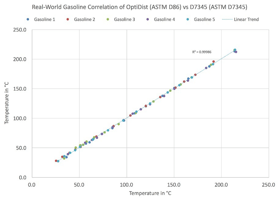 The test results concerning five unique gasoline samples showed an exceptional correlation between ASTM D86 and ASTM D7345, as demonstrated below.