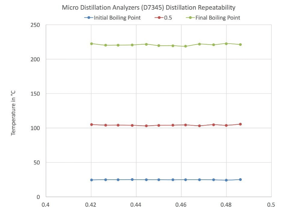 Illustration 2. The tests also showed very high repeatability of micro distillation analyzers for a typical gasoline sample.